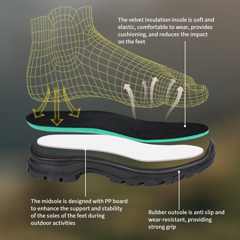 ①Fløjlsfor. Blød under fødderne. Opsuger virkningen. ②PP mellemsål for stabil støtte. ③Ydersål af gummi, der ikke slipper. Greber, holder, forbliver pålidelige.