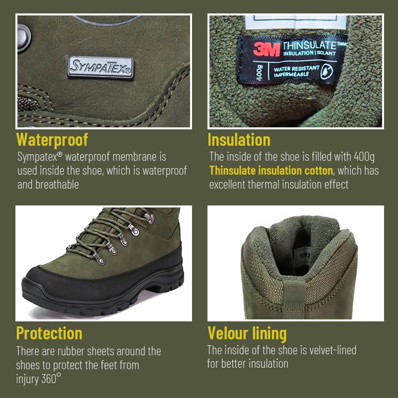 Disse Sympatex vandtætte isolering Thinsulate jagtstøvler er tilgængelige til tilpasning i farver, materialer og detaljer, med MOQ på 800 par, ideelle til brandsamarbejde og gruppeindkøb. Og disse jagtstøvler har følgende fordele: