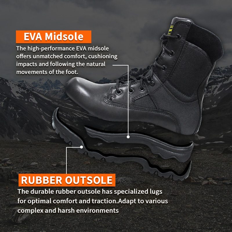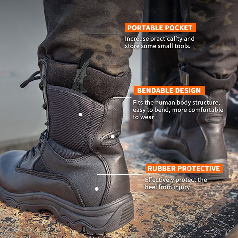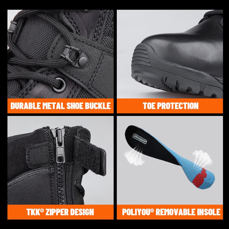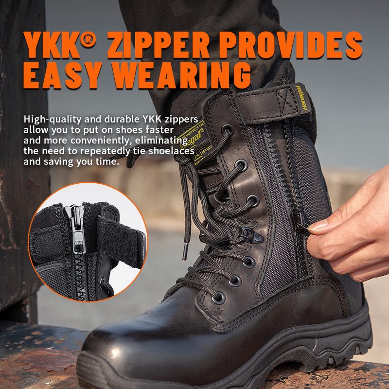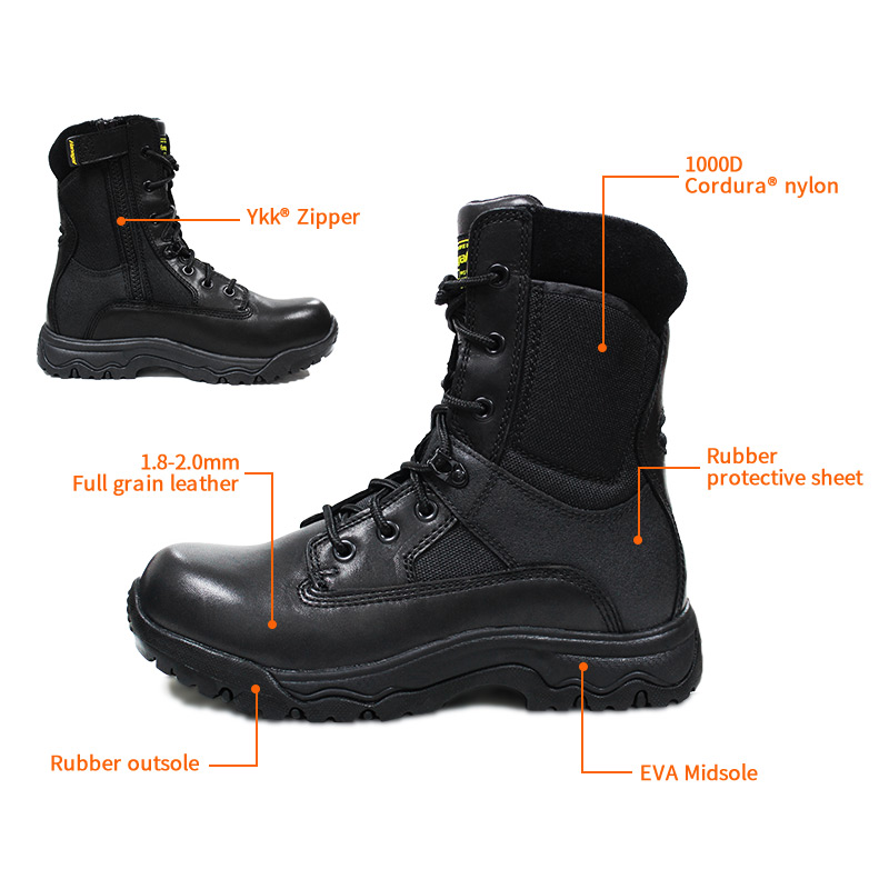 Disse YKK lynlås politistøvler i fuldnarvet læder er tilgængelige til tilpasning i farver, materialer og detaljer med MOQ på 800 par, ideelle til brandsamarbejde og gruppeindkøb. Og disse jagtstøvler har følgende fordele: